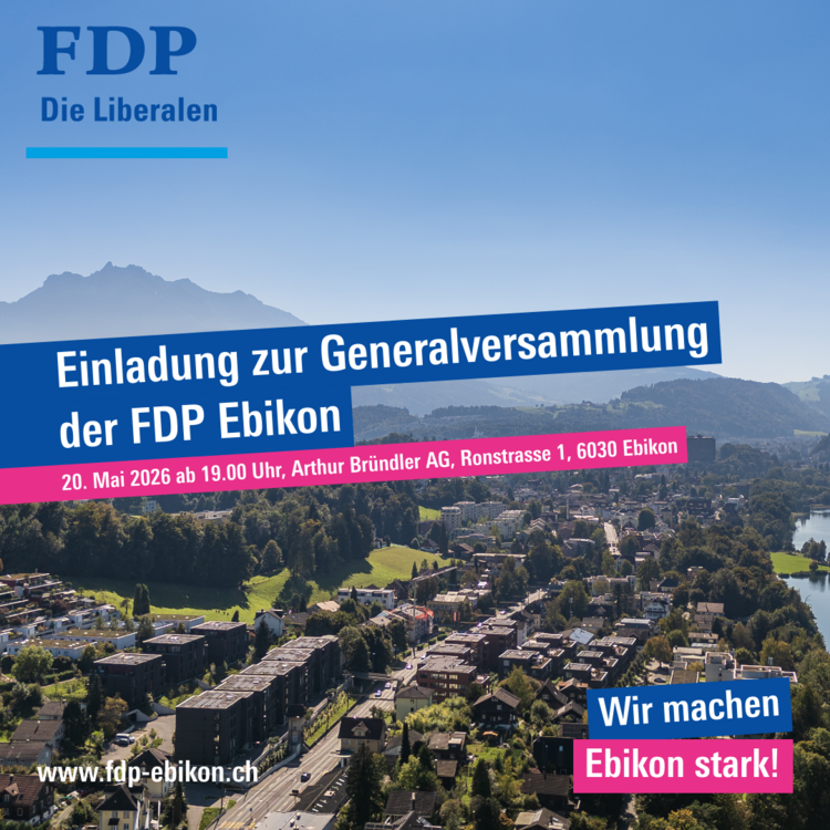Die FDP.Die Liberalen Ebikon lädt herzlich zur diesjährigen Generalversammlung ein. Diese findet am Mittwoch, 20. Mai 2026, ab 19.00 Uhr bei der Arthur Bründler AG in Ebikon statt.