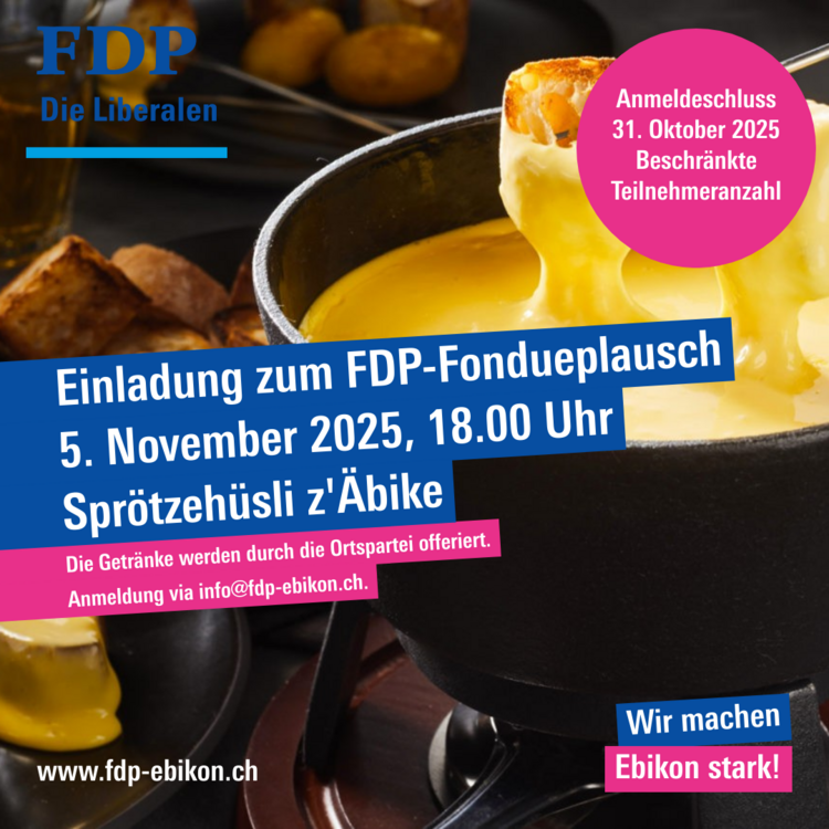 Wir laden Euch herzlich ein zum diesjährigen FDP-Fondueplausch im Sprötzehüsli z'Äbike.